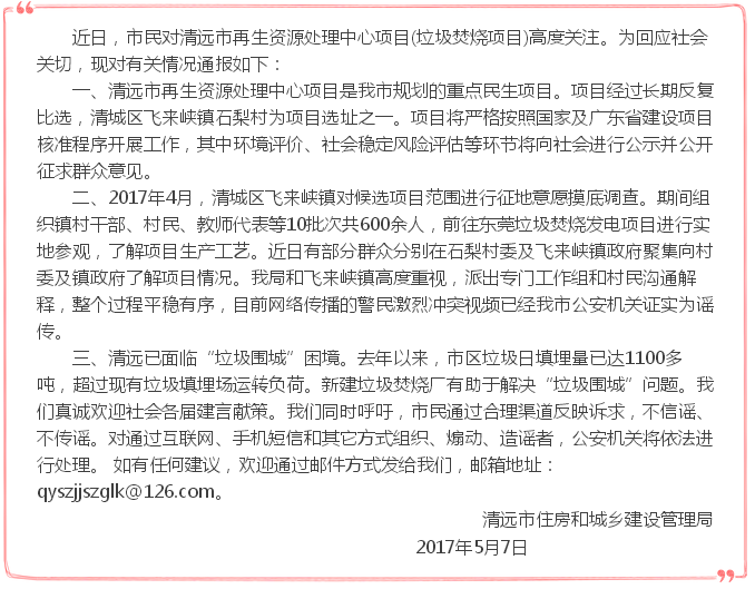 關于清城區飛來峽鎮石梨村清遠市再生資源處理中心項目的情況通報